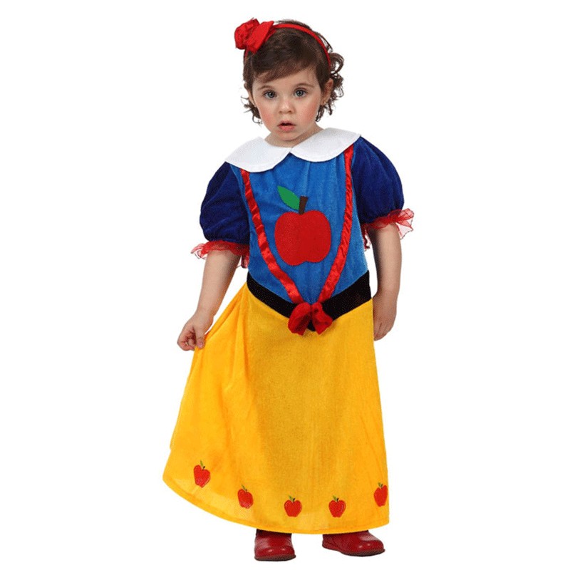 Este disfraz de Princesa de las nieves para bebé que contiene un vestido con una gran manzana roja estampada en el pecho, de manga corta afarolada y falda amarilla con manzanas dibujadas en el bajo. Complementos no incluidos.