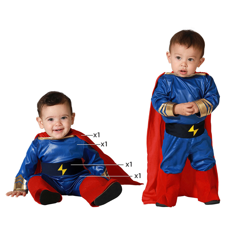 Disfraz de Héroe de comic para bebé que incluye, traje, cinturón y capa. Si te apetece disfrazar a tu bebé, aquí tienes este precioso disfraz de héroe de comic. Estará muy guapo y gracioso, le quedará genial.