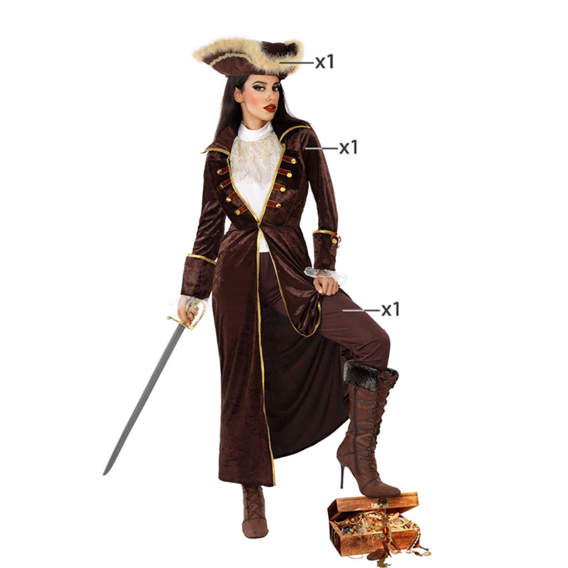 Disfraz de pirata para mujer que incluye, pantalón, camisa, chaqueta y sombrero en color marrón. Si tienes que disfrazarte para acudir a una fiesta aquí tienes este precioso disfraz de pirata, el cual puedes complementar con nuestra sección de complementos. Añade un parche y una espada, te quedará genial.