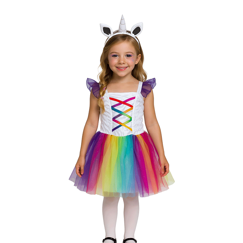 Disfraz de Unicornio infantil que incluye diadema y vestido. Si tu peque tiene que disfrazarse para carnaval o alguna fiesta, aquí tienes este precioso disfraz de Unicornio el cual le quedará genial. Puedes complementarlo con unas medias y un poquito de maquillaje, estará encantada.