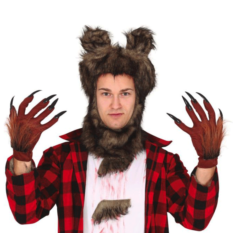 Guantes de hombre lobo con garras para adulto. Se acerca la noche mas terrorífica del año, la noche de Halloween, si te apetece disfrazarte y acudir a una fiesta ponte un disfraz y complementalo con estos preciosos guantes de hombre lobo. Te quedará genial.