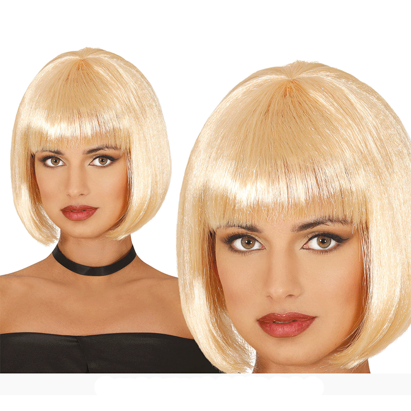 Peluca media melena para adultos, en color rubio. Aquí tienes el complemento perfecto para tu disfraz, te quedará genial.