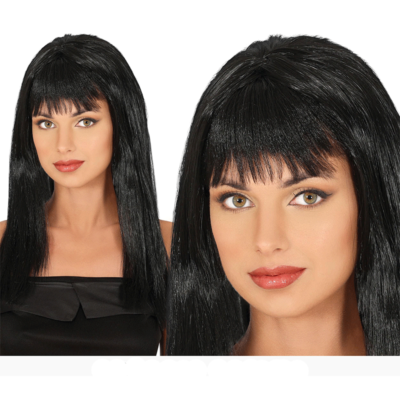 Peluca melena negra para adultos, una peluca muy versátil con flequillo. Es el complemento perfecto para tu disfraz, te quedará genial.