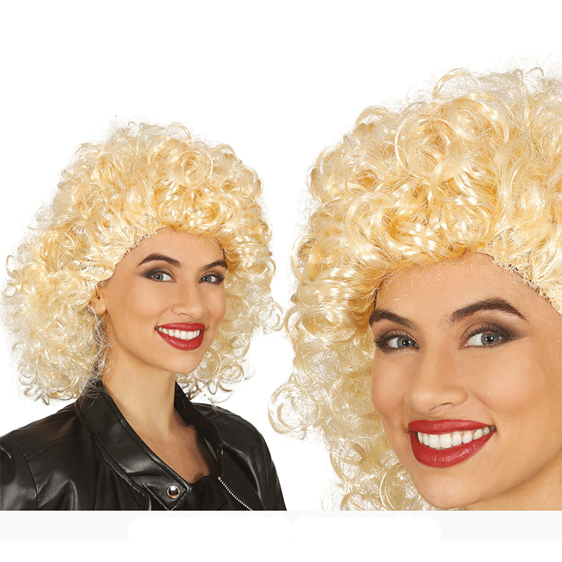 Peluca melena rizada para adultos, en color rubio. Si te apetece disfrazarte de la época, aquí tienes esta preciosa peluca en color rubio. Recordaras a Sandy la de Grease, te quedará genial.